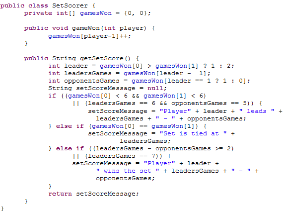 让我们快速浏览一下这两个能运行出相同结果的代码。这个代码是一个网球运动的记分规则。它们都有一个记录比赛中赢家分数的算法,和一个返回包含这个分数消息的算法。假设所有的输入都是有效的,并且没有对无效状态的核查。他们都是用契约式设计的方法编写的,因此所有正确使用这个类的担子都落在这个客户机程序上。您认为哪一个“更优秀”呢,列表1还是列表2?