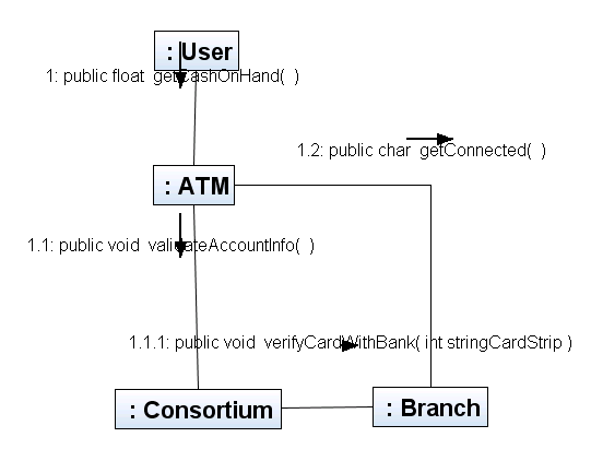 您可以利用此协作图直接创建指定了作用域的序列图。要了解如何执行此操作,请参见教程 UML 建模:创建序列图。