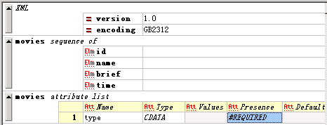 sequence of上点右键,选择Append->ATTLIST,然后如图6所示进行设置其名称为movies,设置Name为type,设置Type为CDATA,设置Presence为#REQUIRED。