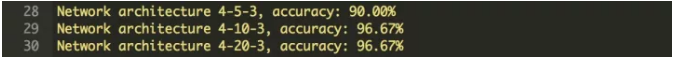 我们为隐藏层中的神经元数目选择三个值:5,10和20,得到(4-5-3),(4-10-3)和(4-20-3)的网络大小。