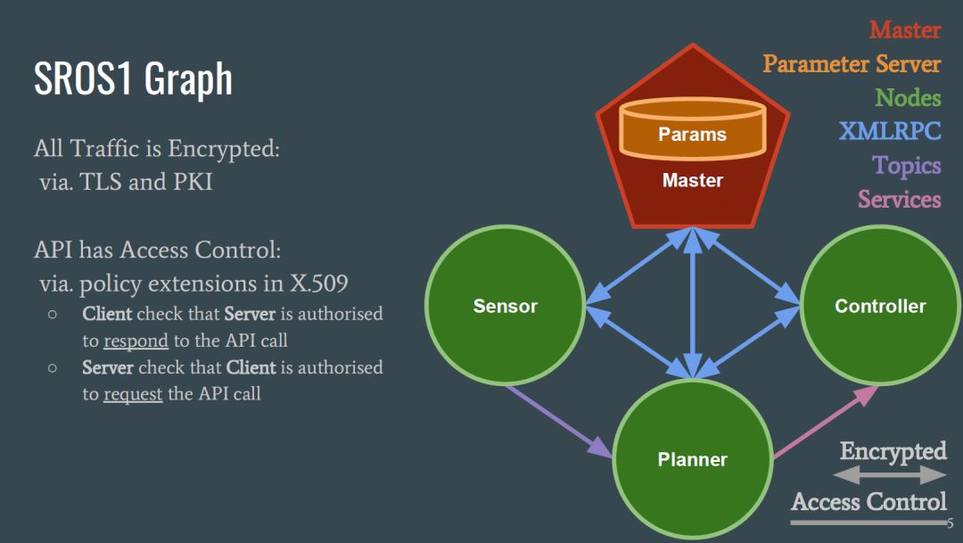 同在ROScon2017上,另一群研究者提出了“SROS”的概念,也就是为ROS附加一系列安全增强策略:安全传输层、访问控制层、进程配置层等。
