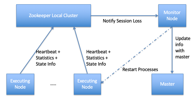 节点宕机的时候,需要通过重启的机制恢复节点,这个重启可以是无状态的,但有些时候也必须是有状态的,因此状态的备份格外重要。节点的宕机检测也是非常重要的,如果察觉到节点宕机,必须很快地使用备份的数据重启。这个功能我们也已经在ZooKeeper框架下实现了。