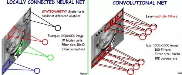在图像处理中,往往把图像表示为像素的向量,比如一个1000×1000的图像,可以表示为一个1000000的向量。在传统的神经网络中,如果隐含层数目与输入层一样,即也是1000000时,那么输入层到隐含层的参数数据为1000000×1000000=10^12,由于多,基本没法训练。所以图像处理要想练成神经网络大法,必先减少参数加快速度。