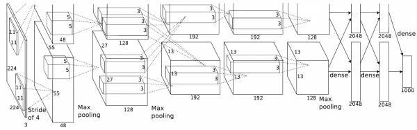 下图即为Alex的CNN结构图。需要注意的是,该模型采用了2-GPU并行结构,即第1、2、4、5卷积层都是将模型参数分为2部分进行训练的。在这里,更进一步,并行结构分为数据并行与模型并行。数据并行是指在不同的GPU上,模型结构相同,但将训练数据进行切分,分别训练得到不同的模型,然后再将模型进行融合。而模型并行则是,将若干层的模型参数进行切分,不同的GPU上使用相同的数据进行训练,得到的结果直接连接作为下一层的输入。