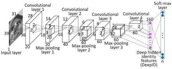 DeepID网络结构是香港中文大学的Sun Yi开发出来用来学习人脸特征的卷积神经网络。每张输入的人脸被表示为160维的向量,学习到的向量经过其他模型进行分类,在人脸验证试验上得到了97.45%的正确率,更进一步的,原作者改进了CNN,又得到了99.15%的正确率。