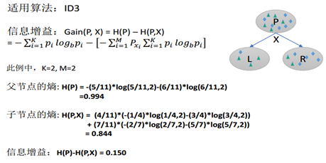 ID3算法:使用信息增益作为分裂的规则,信息增益越大,则选取该分裂规则。多分叉树。信息增益可以理解为,有了x以后对于标签p的不确定性的减少,减少的越多越好,即信息增益越大越好。