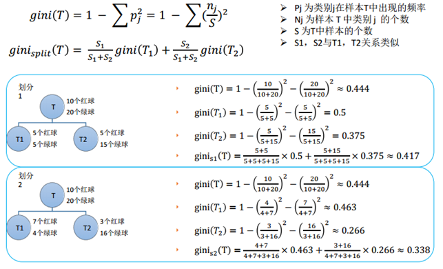 具体这个的计算,我觉得有例子才好理解,下面这个红绿球的例子很好的说明了,如何根据损失函数最小(也就是基尼系数最小)来选取分裂规则。最后GIINs2更小,因此选择它作为分类规则。