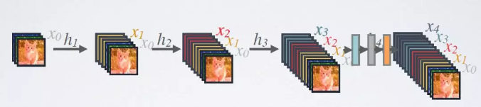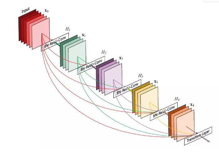 图2 DenseNet网络的密集连接机制(其中c代表的是channel级连接操作)
