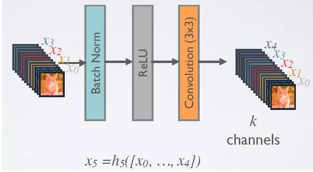 Conv的结构,如图6所示。另外值得注意的一点是,与ResNet不同,所有DenseBlock中各个层卷积之后均输出个k特征图,即得到的特征图的channel数为k,或者说采用k个卷积核。k在DenseNet称为growth