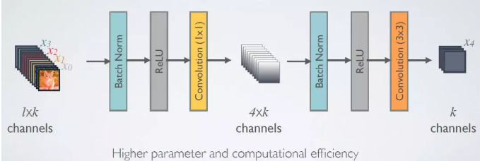 由于后面层的输入会非常大,DenseBlock内部可以采用bottleneck层来减少计算量,主要是原有的结构中增加1x1
