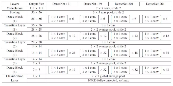 MaxPooling层,后面才进入DenseBlock。ImageNet数据集所采用的网络配置如表1所示:
