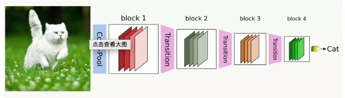 CNN网络一般要经过Pooling或者stride>1的Conv来降低特征图的大小,而DenseNet的密集连接方式需要特征图大小保持一致。为了解决这个问题,DenseNet网络中使用DenseBlock+Transition的结构,其中DenseBlock是包含很多层的模块,每个层的特征图大小相同,层与层之间采用密集连接方式。而Transition模块是连接两个相邻的DenseBlock,并且通过Pooling使特征图大小降低。图4给出了DenseNet的网路结构,它共包含4个DenseBlock,各个DenseBlock之间通过Transition连接在一起。
