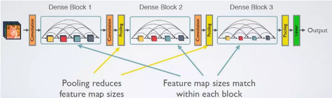 在DenseBlock中,各个层的特征图大小一致,可以在channel维度上连接。DenseBlock中的非线性组合函数采用的BN+ReLU+3x3