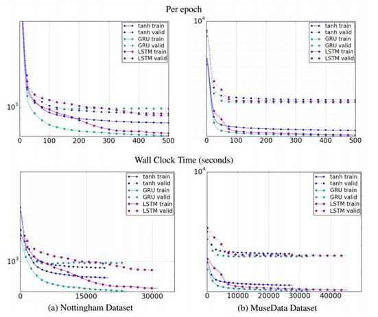 图 11:不同单元类型关于迭代数量(上幅图)和时钟时间(下幅图)的训练、验证集学习曲线。其中 y