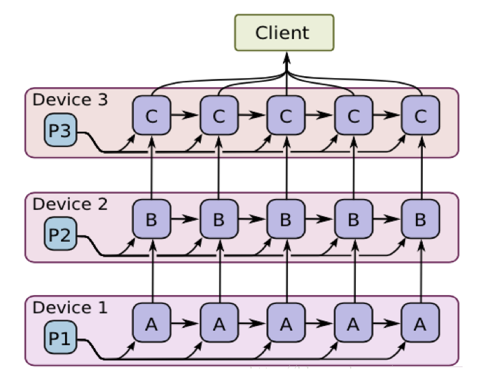 还可以对模型进行切分,让模型的不同部分执行在不同的设备上,这样可以一个迭代的样本可以在不同的设备上同时执行。如上图所示的LSTM模型