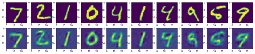 第一行加载MNIST训练集,第二行使用自编码器进行编码和解码,之后重构训练集。但是,重建图像中缺少大量信息。因此,自编码器不如其他压缩技术好,但作为一门正在快速增长中的技术,其未来还会出现很多进步。