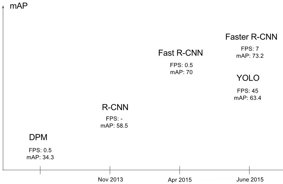X 的 GPU 上能达到45 FPS。更快的Fast YOLO检测速度可以达到155 FPS。而且,YOLO的mAP是之前其他实时物体检测系统的两倍以上。