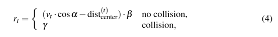 算法实现的细节见[2]。为了鼓励代理更快地驾驶和避免碰撞,我们定义了奖励函数为: