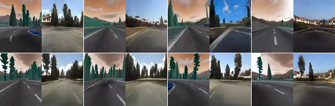 图4:虚拟到真实图像翻译的例子。奇数列是从TORCS截取的虚拟图像。偶数列是根据左边的虚拟图像相对应合成的真实世界图像。