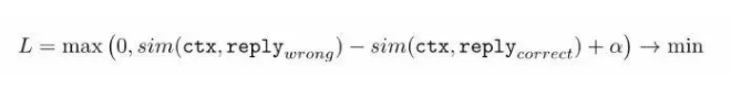 C^T*R/(||C||*||R||)。在推理阶段,我们可以计算给定情景与全部可能答案之间的相似度,并从中选择相似度最高的答案。为了训练选择式模型,我们使用三元损失函数。三元损失函数通过三项因素定义,即情景、回复_正确、回复_错误(context、reply_correct、reply_wrong),即: