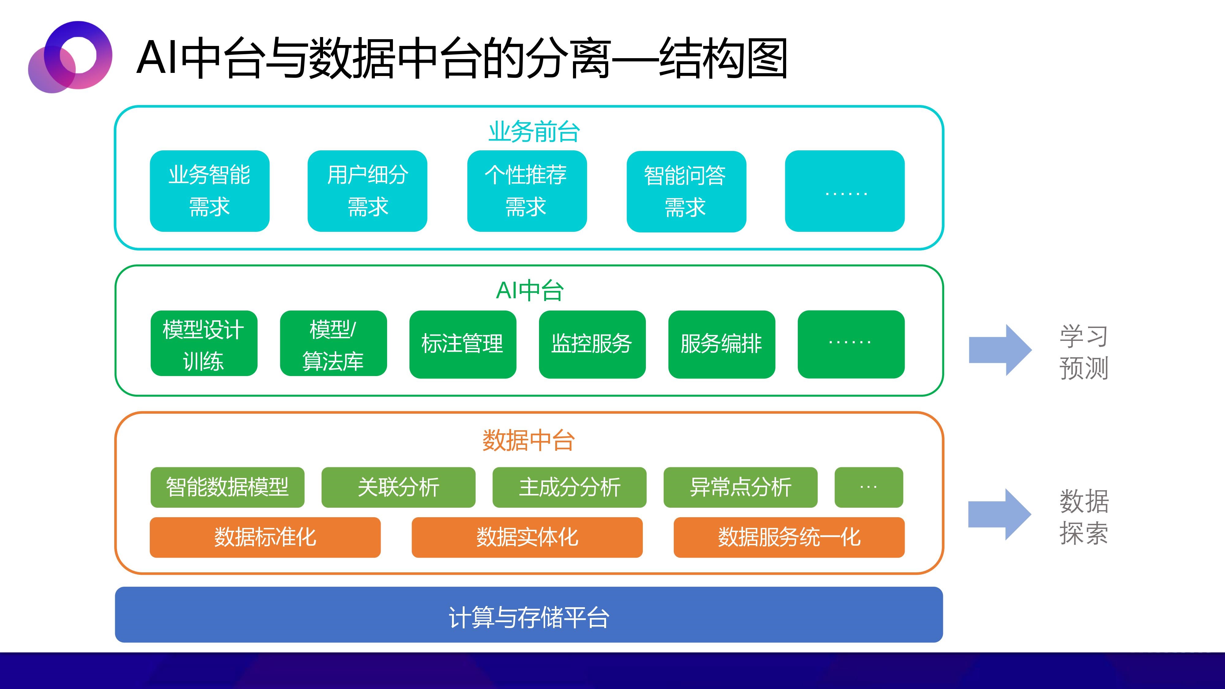 上图是 AI中台与数据中台分离的结构 化图表,自上而下分别是业务前台、AI中台和数据中台,还有底层一些相关的计算存储资源。