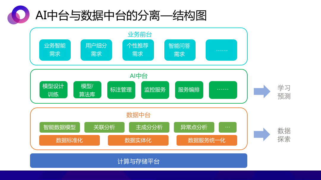 上图是 AI 中台与数据中台分离的结构化图表,自上而下分别是业务前台、AI 中台和数据中台,还有底层一些相关的计算存储资源。