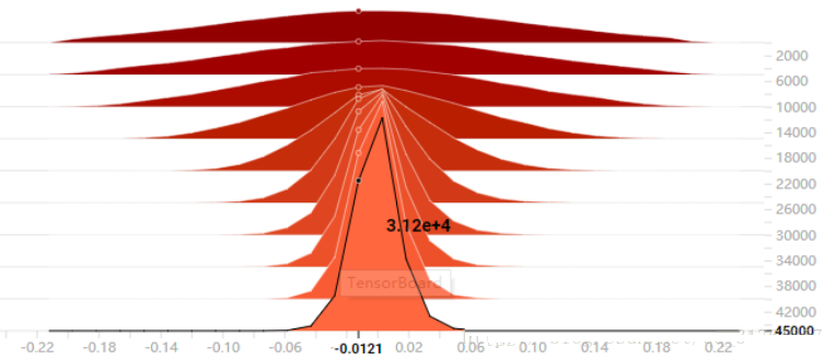 横轴代表权重值,纵轴代表训练步数。颜色越深表示时间越早,越浅表示越晚