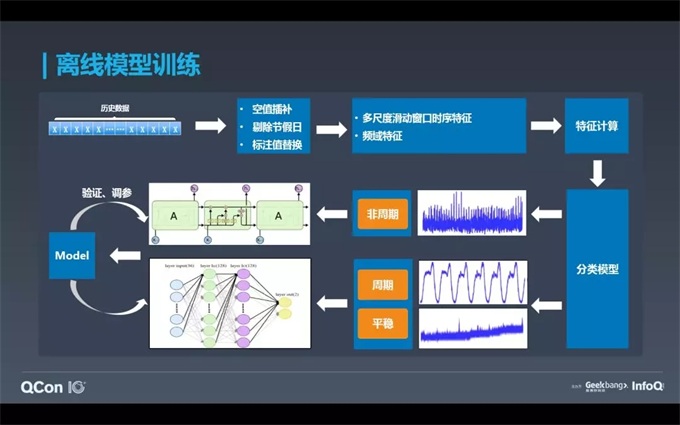 在做完特征提取与指标分类之后,我们也就根据指标的类型使用不同的算法进行模型训练。我们根据线上的人工标注数据持续性的优化我们的模型。我们经历过初期不停的调参和验证之后,我们将模型训练的频率设为了两周,我们每两周重新走下图中的整个流程,这个也是根据我们业务变更的频率所做的考虑。