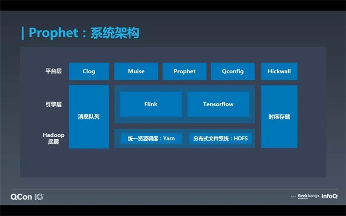 Flink 与 Tensorflow 两套引擎实现。最上层的 Prophet 以平台的方式对外提供服务,Clog