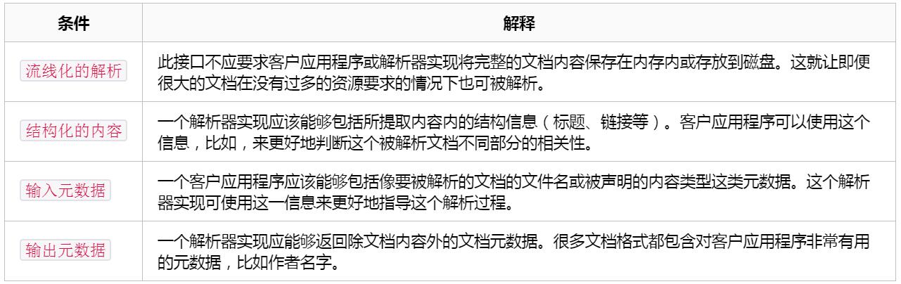 parse 方法接受要被解析的文档以及相关的元数据作为输入,并输出 XHTML SAX 事件以及额外的元数据作为结果。导致这一设计的主要条件如表