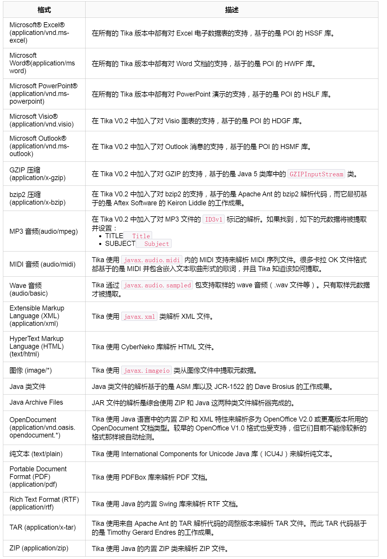 Apache Tika 自带一些解析器类来解析各种文档格式,如表 3 所示。