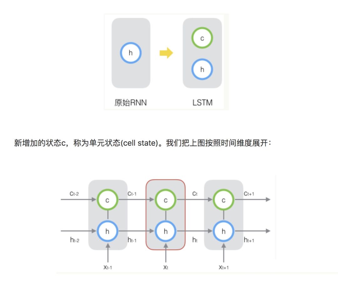 长短时记忆网络的思路比较简单。原始RNN的隐藏层只有一个状态,即h,它对于短期的输入非常敏感。那么,假如我们再增加一个状态,即c,让它来保存长期的状态,那么问题不就解决了么?如下图所示: