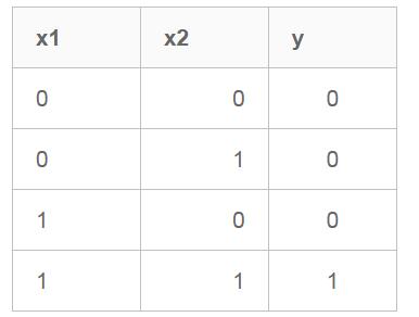 我们设计一个感知器,让它来实现and运算。程序员都知道,and是一个二元函数(带有两个参数和),下面是它的真值表: