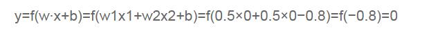 我们令w1=0.5;w2=0.5;b=0.8,而激活函数f就是前面写出来的阶跃函数,这时,感知器就相当于and函数。我们验算一下:
