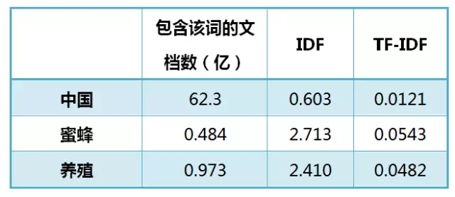 还是以《中国的蜜蜂养殖》为例,假定该文长度为1000个词,"中国"、"蜜蜂"、"养殖"各出现20次,则这三个词的"词频"(TF)都为0.02。然后,搜索Google发现,包含"的"字的网页共有250亿张,假定这就是中文网页总数。包含"中国"的网页共有62.3亿张,包含"蜜蜂"的网页为0.484亿张,包含"养殖"的网页为0.973亿张。则它们的逆文档频率(IDF)和TF-IDF如下: