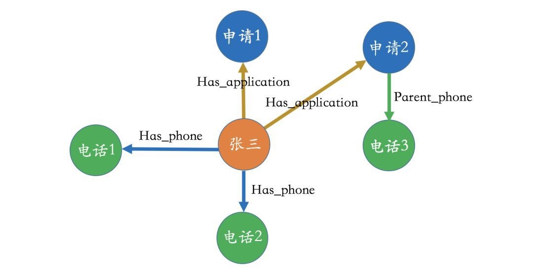 举个例子,可以观察一下下面这个图谱,并试问自己背后的业务逻辑是什么。通过一番观察,其实也很难看出到底业务流程是什么样的。做个简单的解释,这里的实体-“申请”意思就是application,如果对这个领域有所了解,其实就是进件实体。在下面的图中,申请和电话实体之间的“has_phone”,“parent
