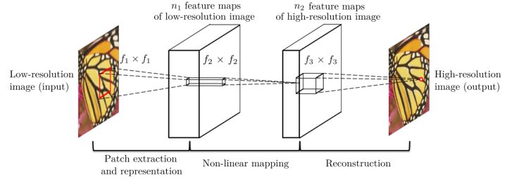 该方法对于一个低分辨率图像,先使用双三次(bicubic)插值将其放大到目标大小,再通过三层卷积网络做非线性映射,得到的结果作为高分辨率图像输出。作者将三层卷积的结构解释成与传统SR方法对应的三个步骤:图像块的提取和特征表示,特征非线性映射和最终的重建。