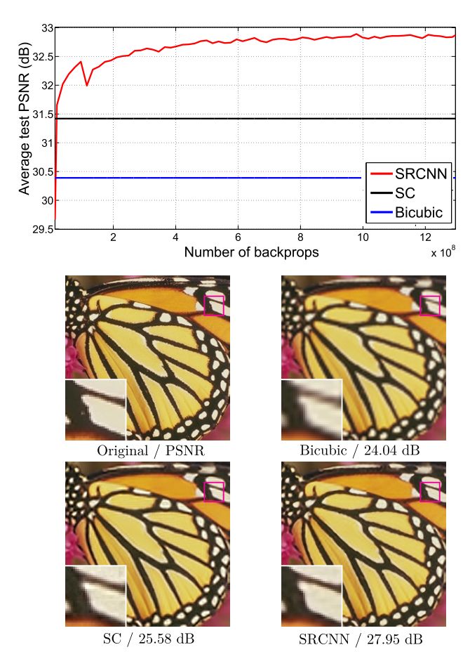 该文章分别用Timofte数据集(包含91幅图像)和ImageNet大数据集进行训练。相比于双三次插值和传统的稀疏编码方法,SRCNN得到的高分辨率图像更加清晰,下图是一个放大倍数为3的例子。