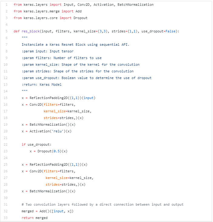 核心是采用9 个ResNet blocks对原始图像进行上采样。来看一下Keras上的实现!