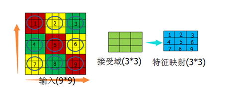 先说没有接受域的情况,如果特征映射有9个神经元,这9个神经元与9*9的输入做全连接,那么需要的权重个数为9*9*9=729个。添加了接受域后,9个神经元