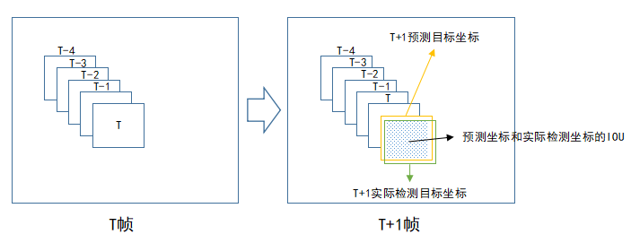 如上图,在T+1帧中,我们根据目标前面若干帧的坐标预测它在本帧中的坐标(预测坐标),然后再将该预测坐标与本帧实际检测的目标坐标进行数据关联。之所以需要先进行预测再关联,是因为为了减少关联过程的误差,常见预测算法可以使用卡尔曼滤波,根据目标前面若干坐标值预测下一坐标值,并且不断地进行自我修正,卡尔曼滤波算法网上有开源代码。IOU(交并比)是衡量两个矩形方框的重叠程度,IOU值越大代表矩形框重叠面积越大,它是目标检测中常见的概念。在这里,我们认为IOU越大,两个目标为同一物体的可能性越大。