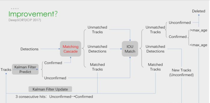 这是DeepSORT算法的流程图,和SORT基本一样,就多了级联匹配(Matching