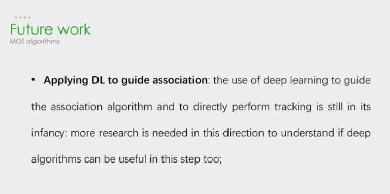 它在最后提出对未来的方向里有这样一句话,用深度学习来指导关联问题。其实现在基于检测的多目标追踪都是检测模块用深度学习,Re-ID模块用深度学习,而最核心的数据关联模块要用深度学习来解决是很困难的。现在有一些尝试是用RNN,但速度慢、效果不好,需要走的路都还很长。