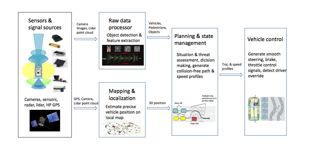 自动驾驶是一个复杂的软硬件相结合的系统。无人车主要通过摄像头,雷达等设备来感知周围的环境,依据所获取的信息来进行决策判断,由适当的工作模型来制定相应的策略,例如预测本车与其他车辆,行人等在未来一段时间内的运动状态。在规划好路径和行为之后,接下来需要控制车辆沿着期望的轨迹行驶,主要包含横向控制(转向)与纵向控制(速度)。当然,上述的动作都是基于传感器实时获取环境信息所做的局部路径规划下的动作,还需要与基于完整环境信息(GPS)的全局路径相结合。下图给出了一个基本的自动驾驶系统的框架图。
