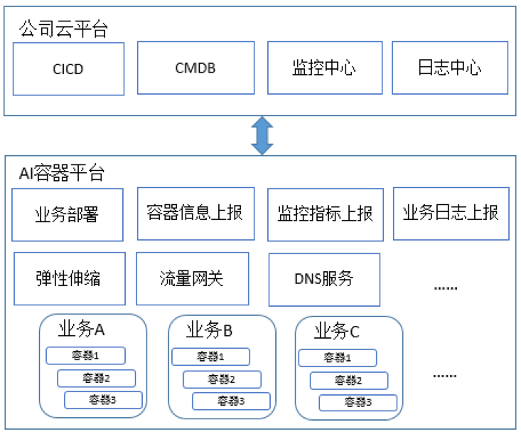 在线业务容器化落地所涉及到的功能模块分两部分:公司云平台 和 AI 容器平台。云平台是用户入口,AI