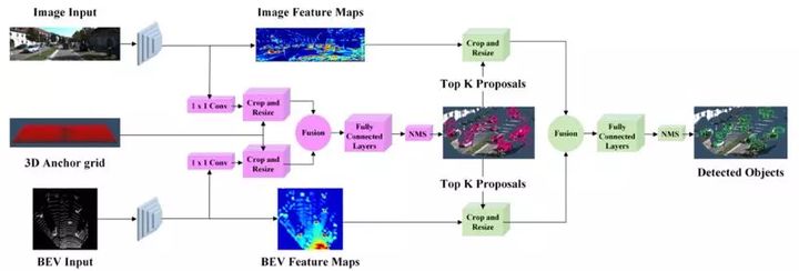 AVOD,AVOD输入RGB图像及BEV(Bird Eye View),利用FPN网络得到二者全分辨率的特征图,再通过Crop和Resize提取两个特征图对应的区域进行融合,挑选出3D
