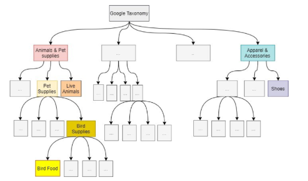 在 Criteo,我们有数万个电子商务合作伙伴,他们为我们提供了总计 250 多亿种产品的目录。这些产品通过我们的在线广告推荐给互联网用户,确保这些互联网用户与我们的电子商务合作伙伴的广告活动相关。为了保证推荐的质量,我们 需要标准化这组异构目录 。特别是,每个产品都应归入其电子商务类别。而且无论原始目录如何, 所有这些产品的这组电子商务类别都应该是相同的 。然而,每个电子商务合作伙伴都为我们提供了每种产品的类别,但不是用 通用的参考 。在 Criteo,我们使用了一种由谷歌提供的被电子商务生态系统广泛使用的分类: >谷歌产品分类法(Google Product Taxonomy)。它仅用于 零售产品 ,而不同类型的产品使用了其它技术。然后,我们用这个分类法将零售产品重新分类。所有可能的零售产品都分类到这个树型结构中。