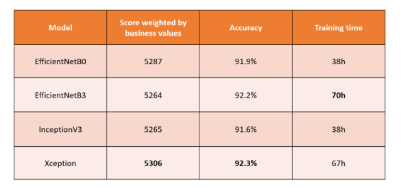 在上表中,我们看到了指标之间的并不都是相关的。训练时间通常是一个折中(更长的训练时间通常与更好的精度相关,但也与更大的模型相关,并不总是值得期待),但在这里并不总是有益的。通过 比较我们不同模型的加权得分 ,我们注意到 EfficientNetB3 虽然在 ImageNet 上比所有其它这里展示的模型要好,但在我们的测试集上表现不佳:精度很高,但加权得分很低。 Xception,针对基于大数目的类别进行分类而设计 [2],效果最好,虽然和其他模型的区间相同 。