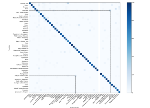 在混淆矩阵中,我们垂直方向记录预测到的类别,水平方向记录真正的类别。当一个模型预测到正确的类别,它会被记录在对角线中。在上图中,我们看到了我们的模型预测为“洗发水 & 护发素”而真实类别为“皮肤护理”的产品为 15%(或预测“婴幼儿上衣”而真实类别为“婴幼儿外套”的产品为 10%),这些产品在视觉上确实彼此相似。