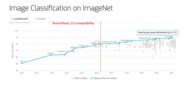 在上图(红色圆圈)中,我们看到 Inception V3[1] 和 Xception [2]虽然不错,但性能优于 TensorFlow 1.15 中没有的更多的最新模型。